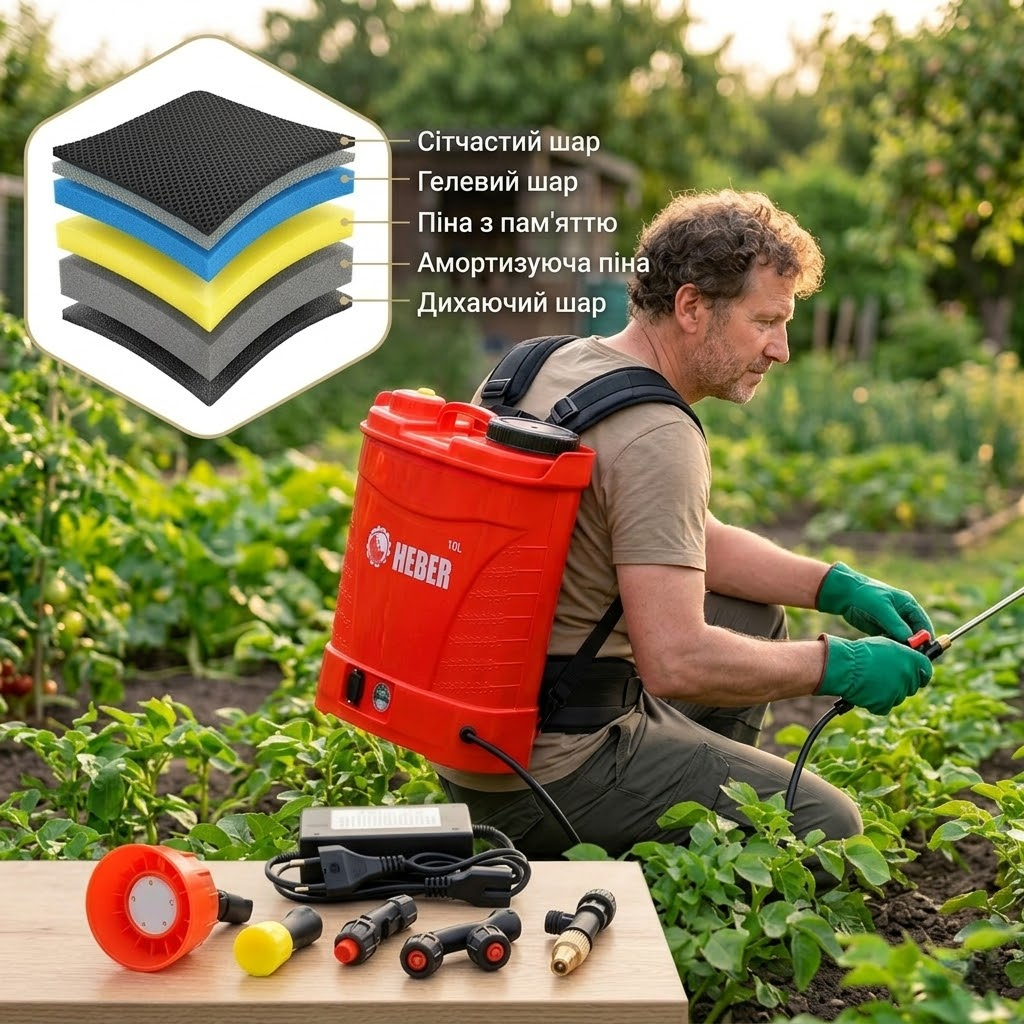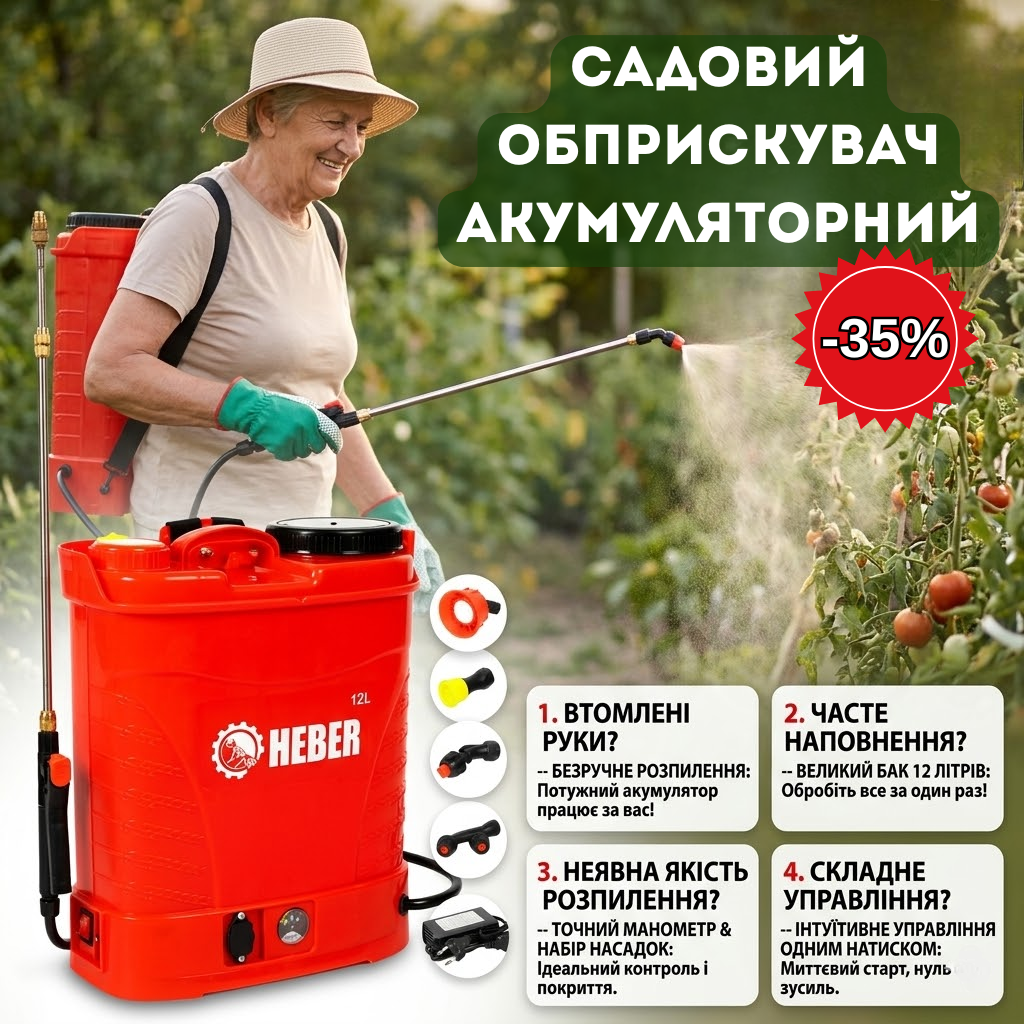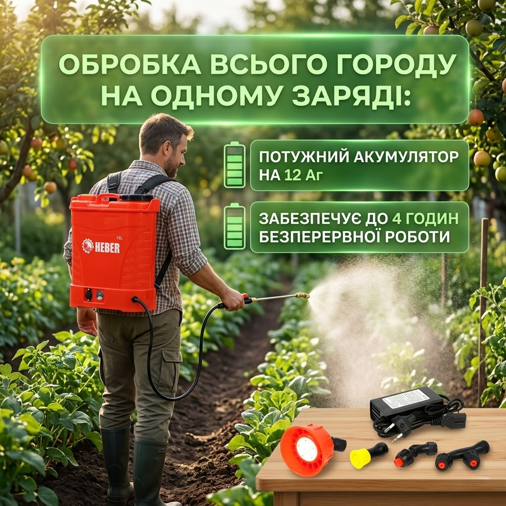 Раніше рука відвалювалася качати важіль. З Heber просто тиснеш кнопку — і жодної втоми. Обприскав сад утричі швидше